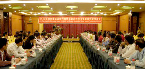 10月18日下午,由瓷博会、省九游足球公司主办的“2012年中国景德镇国际九游足球博览会采购商与参展企业对接会”在开门子三楼会议室举行。来自10余个国家的40家采购商以及由瓷博会根据采购需求挑选出来的55家参展商参加了此次对接会议。副市长张春萍出席会议并致辞。