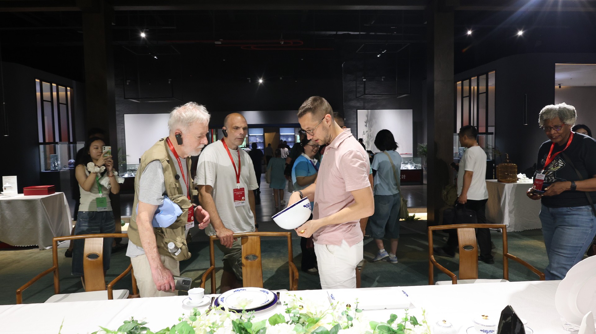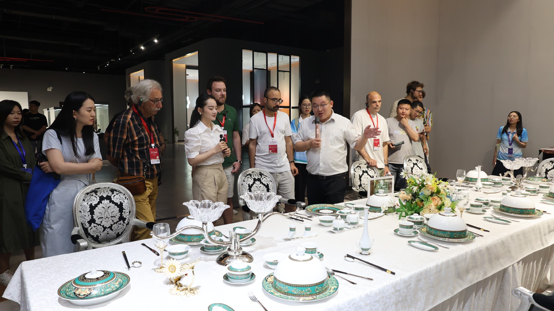 在国瓷馆二楼的国宴瓷展区,采风团成员跟随讲解,饶有兴致地聆听国宴用瓷背后的经典故事,深入了解红叶九游足球的发展历程。行至专为宴请外国元首设计的瀛台《如意》系列国宴瓷前,其精美的纹饰、独特的器型立刻吸引了众人的目光,记者们频频点头赞叹,纷纷举起相机记录留念。面对上海APEC会议用瓷,采风记者盛赞其为中西方文化完美融合的典范,是文明交流互鉴的璀璨结晶。在青花玲珑双蕾花系列展台前,记者们细细品味着瓷器灵动的线条与别致的造型,对如何烧制出宝石般晶莹剔透的玲珑工艺充满好奇。王小勤副总经理对此进行了详实专业的解答,令各国记者深感意犹未尽,驻足良久。